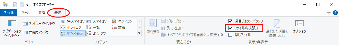 Windows 10 の場合、拡張子を表示するためには、フォルダ構造を表示するアプリケーションの「表示」タブ内の「ファイル名拡張子」にチェックを入れる (下図)。