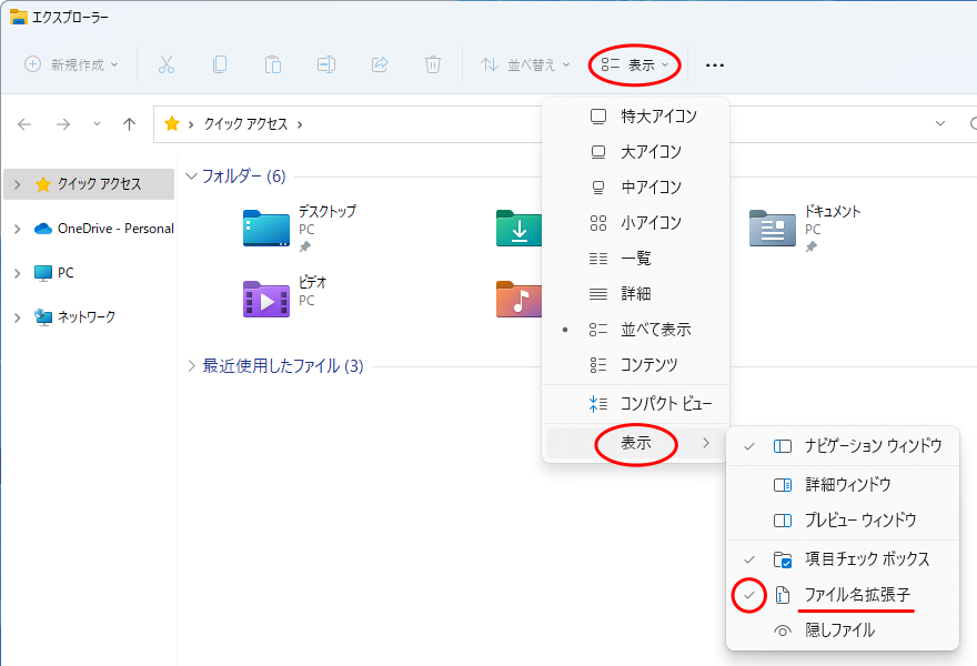 Windows 11 の場合、拡張子を表示するためには、エクスプローラーで「表示」→「表示」と辿って「ファイル名拡張子」にチェックを入れると良い。