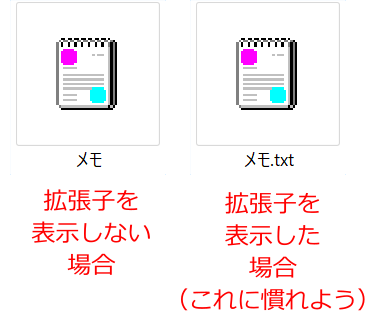 下図のように「メモ.txt」というファイルがあったとき、ドット「.」で区切られた「txt」が拡張子である。